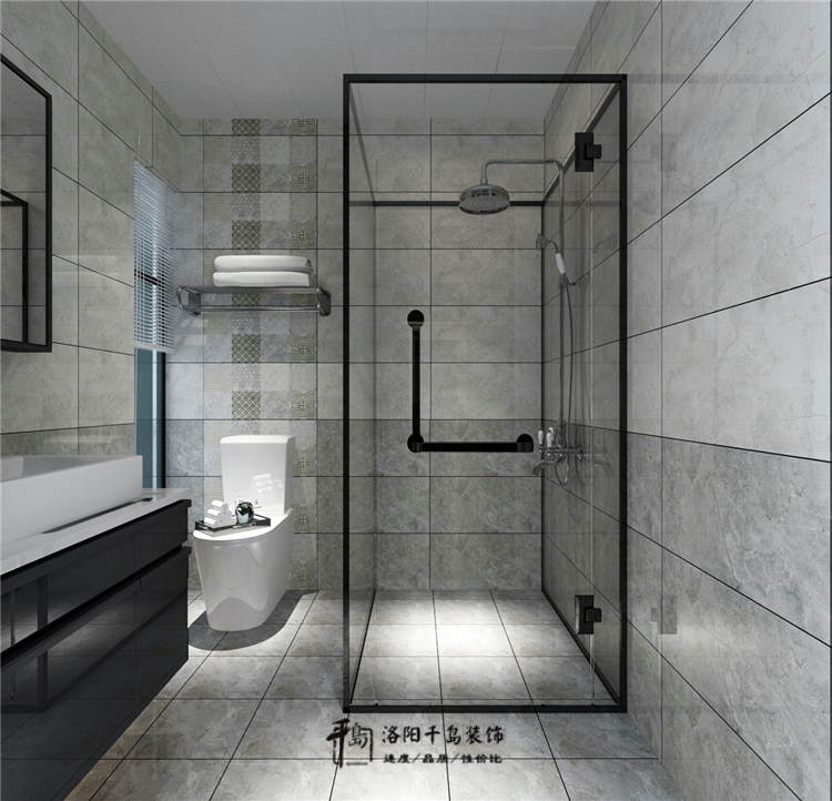 主臥的里衛(wèi)生間用于地板顏色差別較大的灰色瓷磚作為空間上的分割,層次分明。